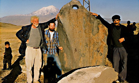 | Tažné závěsné balvany – Ron Wyatt (vlevo) u jednoho z mnoha tažných balvanů z archy, které byly nalezeny v blízkém okolí. |