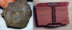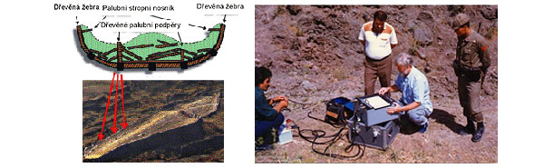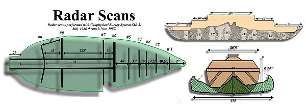 Kovový nýt – stále ještě zasazen ve zkamenělém dřevě (vlevo), ukazuje, jak byla loď zkonstruována. Dokazuje vysokou schopnost práce s kovem, dřevem a znalost jejich zpracování a použití ve stavitelském oboru. Časem bylo provedeno radarové snímání celé struktury – podél celé délky, šířky a horizontálně ze stran. Půdou pronikající radar ukázal ještě podrobněji týž vzorek, který odhalily detektory kovů. Radar odhalil další informaci, která byla ohromující. Na radarových záznamech se objevily stěny, dutiny, dveře blízko jižního konce („předku“) a rampy. Blízko přídě byly dvě válcové nádrže 4,2 m vysoké a 7,2 m napříč, s kovovými obručemi kolem obvodu.