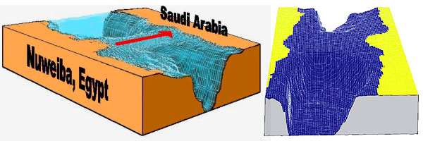 I kdyby bylo moře vysušené, přechod by byl velmi obtížný, a to kvůli příkrému srázu na stranách, kde dosahuje místy až úhlu 43°, ovšem na místě valu je zhruba 6° úhel srázu. Je ale jedno místo, jehož spád by lehce přešli jak lidé tak dobytek, kdyby byly vody odstraněny. To je na přímce mezi Nuweibou a protějším pobřežím v Saudské Arábii. Hloubku sondující výpravy odhalily hladký, mírný svah spadající z Nuweiby do zálivu.