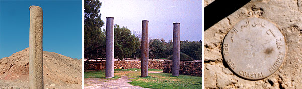 | Vlevo: Pamětní sloup v Nuweibě z roku 2465. Nápisy na něm byly již těžko lokalizovatelné, ovšem slabé náznaky tam byly. Místní beduíni tento sloup označili za velmi starý, patrně z dob Mojžíšových... Uprostřed: Sloupy v Aškalonu a vpravo pečeť na tomtéž sloupu na druhé straně Saudské Arábie, kde byl zkonfiskován. |