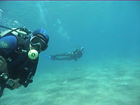| Potápěči při ponoru. Všimněte si písečného dna. |