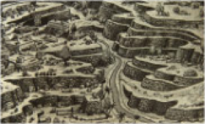 | Pohled na Gomoru s přibližnou rekonstrukcí města (vlevo). |