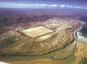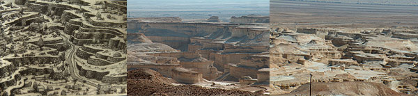 Letecký snímek hory Sodom. V pozadí je vidět město Sodoma ve čtvercovém útvaru, tak jak bylo tenkrát zvykem města stavět. Zvláštností okolí Mrtvého moře je, že je velice vyprahlé. Roční srážky jsou zde úhrnem pouze asi 5 cm za rok. Mnoho kritiků tvrdí, jak mohly tyto útvary vydržet 3960 let, aniž by došlo k devastaci těchto objektů. Přece popel rozfouká vítr apod. V dané oblasti jsou ideální podmínky pro existenci takovýchto útvarů. Města, která lehla popelem, byla po staletí zakonzervována několikacentimetrovou krustou, která je po celé ploše měst. Vznikla tím, že roční slabé úhrnné srážky ( 5-10 cm) spolu s prachem vytvořily jakýsi ochranný krunýř, který díky velkému teplu a suchu okamžitě zatvrdne a vytvoří ochranný obal kolem kontur staveb. Kdyby byly srážky větší, voda by popel vymlela a popel by se rozpustil. Kdyby byly slabší, nebyly by dostatečné k vytvoření krusty a silný východní vítr by celá v popel proměněná města rozfoukal. |