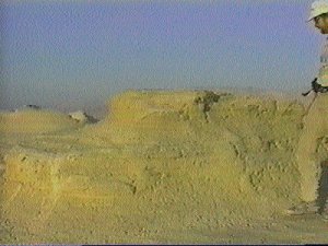Některé z nich měly na vrcholu něco, co vypadalo jako plochý oltář nebo platforma. Další překvapení, jsme zažili, když jsme přišli na to, že místní těžební společnost (jedna z těch, kteří těží nerosty z Mrtvého moře), vybudovala zpevněnou silnici vedoucí přímo středem naleziště. Tato silnice se vlastně připojovala k hlavní silnici u strážní budovy, kde jsem byl v červnu vrácen zpět. Tato silnice byla vybudována přímo přes popelovou zeď, která od nás byla na sever. Pokračovali jsme po této silnici a když jsme přejeli přes vrchol zdi, naskytl se nám dech beroucí pohled. Zeď byla čtvercová a zcela obklopovala plochu jednoho a půl čtverečního kilometru.