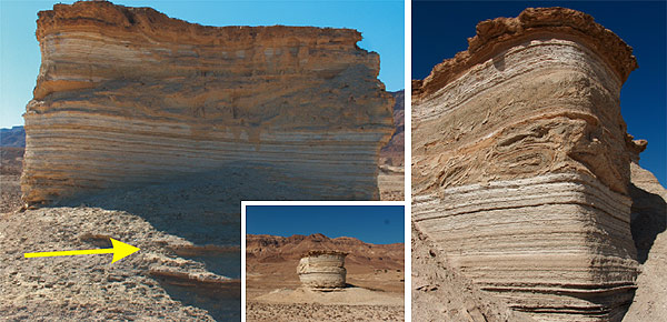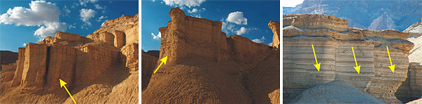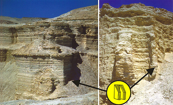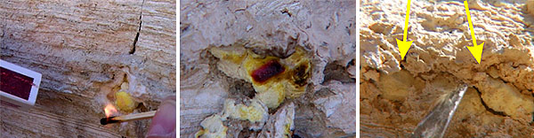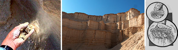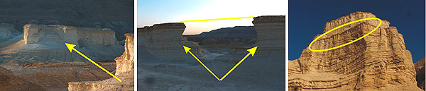 Výzkum R. Wyatta přinesl fascinující objev. Zjistil totiž, že látky které se spalují se sírou, produkují jako odpad POPEL, který je těžší než původní spalovaná hmota. To vysvětluje, jak se tato města mohla uchovat po celých 3960 let! Lze ohněm spálit skálu? Odpověď nejdete v 1. Královské 18,38, kde je příběh o Elijáši a knězích Baale. Venkovní vrstva těchto útvarů je poněkud tvrdší, což napomohlo tomu, aby si tyto hustě nakupené hromady popele uchovaly tvar a formu. Ale uvnitř je zase jen měkký drolivý popel! Popel má konsistenci jemného prášku, jako třeba mastek. Na následujících snímcích vidíte další části zničených měst. Nic než ohromné hromady bílého popele. Jak na povrchu, tak i ve vnitřních částech staveb se nachází stále stejný jemný popel.