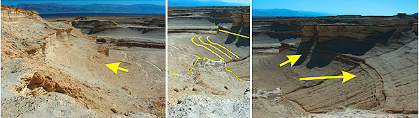 Periodicky se ve stěnách objevují prolákliny (otevřená místa), brány a sloupoví města, kde je vidět v podstatě i ulice a části paláců. Tyto široké ulice mají po obou stranách domy a vedou do postranních malých uliček. To vše není přírodní vápencovitý, či jiný útvar, ale popelem spálené stavby, které jsou pokryty šupinou o síle několika málo cm a tím jsou zachovány, i přes pokročilou erozi, celkem jasné kontury staveb. Pokud provedete hloubkový zásah do těchto staveb, jsou zčásti ztvrdlé a sněhově bílé a to i do hlubší části staveb, kterou jsme takto testovali. Ale i v hlubších místech staveb se stále nachází jen stejný popel. Nemá změněné nic ze svých vlastností popelu. Ohromné hromady popela nám žel znemožňují projít se dostatečně po těchto ulicích! V mnoha místech je cítit pod nohama dutou zem, což svědčí o výplních. Hrozí propadnutí a tudíž není možno tyto prozkoumat. Nepochybně se zde nacházejí celé místnosti a patra, která jsou slisována v jednu řadu s kusy shořených trámů, lidských těl a jiného materiálu. Ron Wyatt zde nalezl moho pozůstatků. V říjnu 1990 použil molekulární frekvenční generátor, aby v bádané oblasti provedl elektronický průzkum. Nalezl skrýš na zlato. Malé odlupky a kousky tohoto předmětu odvezl do laboratoře a otestoval je. Výsledky ukázaly, že se jedná o soli zlata, vedleší produkt při odpařování zlata. Druhý objev byl zoxidovaný (spálený) bronzový hrot sodomitského oštěpu. Měl na délku asi 12cm. Bylo jich tam několik. Při naší návštěvě jsme nalezli také mnoho zajímavých předmětů, ale tyto jsou předmětem zkoumání. Domnívám se však, že jsme nalezli kousky koster a dřeva.