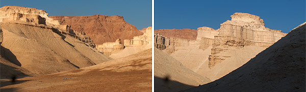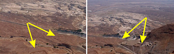 | Okolí Masady s ještě viditelnými pozůstatky obléhání římskou armádou v roce 73, tak jak ji popsal J. Flavius ve své knize Války Židovské a starožitnosti Židovské. V pozadí si povšimněte světlejší části Gomory od okolní přírody. |