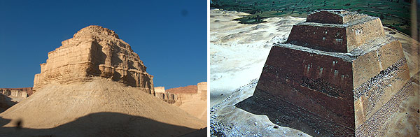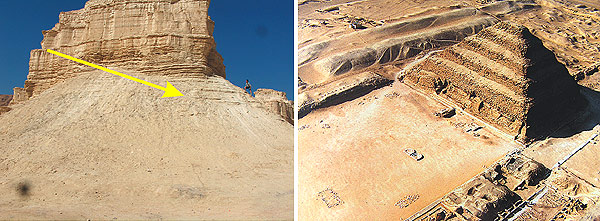 Ron Wyatt v této oblasti také objevil jasné a nesporné popelnaté pozůstatky několika ziguratů. Zigurat je stupňovitá věž ve tvaru pyramidy, která se ve starobylých kulturách používala jako chrám pro uctívání pohanských bohů a modloslužbě. Na nejvyšším patře ziguratu byl obvykle malý oltář, nebo chrám, kde kněží prováděli obřad obětování apod. Ziguraty v Sodomě a Gomoře se využívaly k rituálům, při nichž se přítomní oddávali promiskuitním a homosexuálním hrátkám, přímo Bohem zakázané (Juda 7, 3. Moj. 18,22-30, 20,13-16, 1. Řím. 1,27.29, 1. Kor. 6,9-10,). Tyto „náboženské“ obřady nabíraly u obyvatel těchto měst rozměrů nespoutané velikosti. Na snímku dole vidíte velikost chrámu k přirovnání kolegy asistenta. Směrem dolů jsou ještě i přes pokročilé stádium eroze patrny stupňovité schody asi do chrámu... na dalších snímcích vidíte jak takové chrámy vypadaly v minulosti. Měly různé tvary a byly zasvěcovány např. bohu větru, slunce, plodnosti apod.