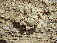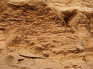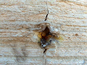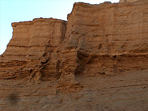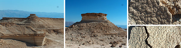 | Obětní oltář na střeše, kde docházelo pravděpodobně k obětním rituálům. Na vrchní části je ještě zachovalá rovná deska, která utrpěla erozí a časem jen málo újmy. V pravo vidíte části desky, kterou jsem odlomil. Je pórovitá, ale perfektně rovná. Je zničená pouze po náporu sirného deště, který ji způsobil na povrchu jen nabobtnalé kousky. Jsou to kapsle s vyhořelými sirnými koulemi. Materiál musel být ušlechtilý, že si zachoval svůj tvar. |