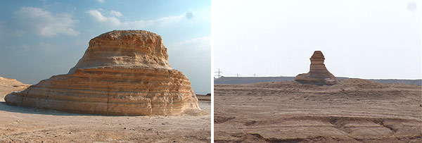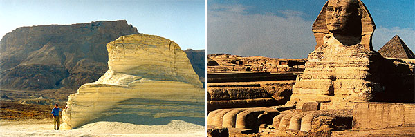Ron Wyatt objevil i zbytky několika sfing. Je to socha se zvířecím tělem, která má někdy lidskou hlavu. Nejznámější sfingy jsou ty, které se nacházejí v novodobém Egyptě. Některé ze sfing v Sodomě a Gomoře si poměrně dobře zachovaly svůj tvar a lze je v terénu snadno identifikovat. Tak je tomu i na obrázcích které vidíte, kde je zbytek obrovské sfingy odpočívající na masivní rovné plošině. Eroze některé z těchto starobylých sfing z velké míry ohlodala, jako např. tu, kterou jsem vyfotil v Gomoře. Do těchto oblastí nevedou žádné cesty – při každé cestě za poznáváním zpopelnatělých trosek měst jsme museli nechat své vozidlo daleko odsud a vydat se na túru po svých... Tak jako Wyatt, i já jsem však cítil, že pokud byly v této oblasti opravdu zpopelnatělé pozůstatky měst, která kdysi na tomto místě existovala, pak určitě Bůh zanechal něco, co by potvrdilo, že se nemýlíme a rozptýlil tak veškeré pochybnosti. Wyatt se za několik měsíců, v říjnu 1990, vrátil a našel přesně to, co potřeboval. Čekal zde na něj důkaz pro jeho tvrzení. Zrovna tehdy přišel déšť, což je v této oblasti jev velice vzácný. Přesto ale zapršelo – a déšť odplavil velké množství uvolněného popela, což mělo za následek, že se z jedné ze zpopelnatělých staveb odloupla vrstva zhutnělého popela. Důležitý materiál pro podrobné prozkoumání. Wyatt objevil, že tyto rozpadlé kusy popela jsou doslova posázeny tisíci malými kuličkami SÍRY! Lidé tak dostali první vědecký důkaz o tom, že zde opravdu z nebe padal oheň a síra! To, jak nahodile jsou tyto drobné různě velké hrudky síry rozložené na povrchu úlomků, přesně odpovídá představě o něčem, co padá na zem jako déšť. Když na města padal déšť hořící síry, všechno bylo v plamenech – až města shořela a hrudky hořící síry udusily zpopelnatělé trosky. Kolem nedohořelé síry se vytvořilo jakési pouzdérko (kapsle), které ji po celou dobu uchovávalo nedotčenou. Hrudky síry jsou různé velikosti – většina je malinkatých, velikosti golfového míčku, ale některé jsou statné kusy o váze i několika kilogramů. Všude ve vzduchu je cítit sirný zápach. Jak silný musel být zásah proti těmto městům! Všude se nacházejí vyhořelé kapsle síry. Jsou jich zde miliony. Jen některé však skrývají ještě nevyhořelou síru a ty jsem hledal se svým kolegou po vzoru Rona Wyatta. Na dalších snímcích vidíte, co jsme našli.