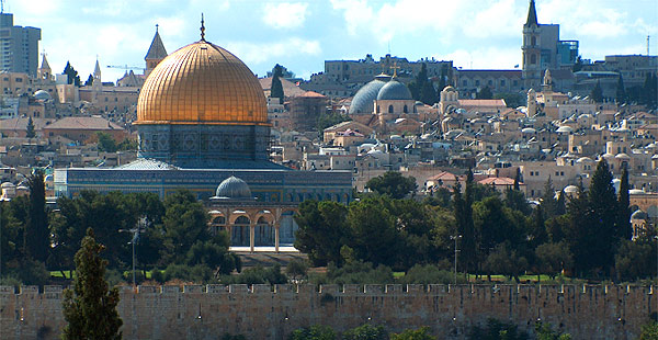 | Pohled na Chrámovou horu ze zahrady Getsemane. |
